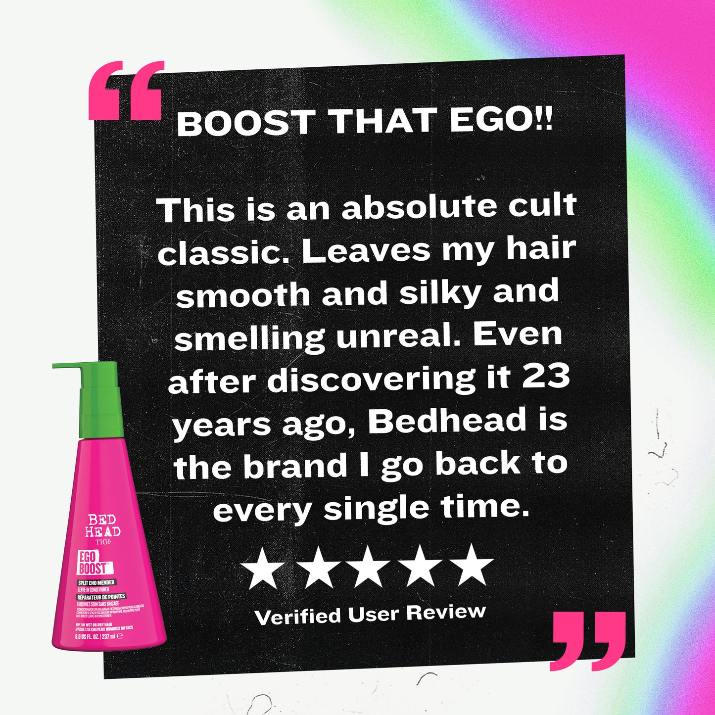 - Bed Head’s Ego Boost™ Leave in Conditioner; a powerful smoothing formulation, not only designed with, but used by salon professionals. Delivering salon results and salon experience at home.
