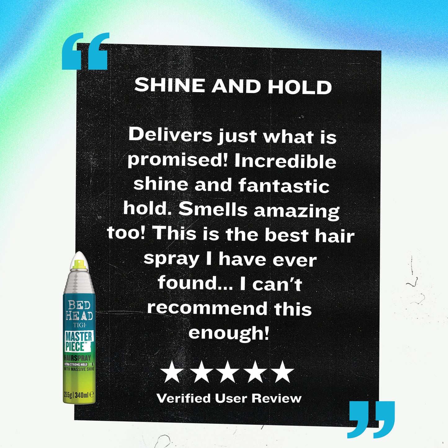 - Masterpieces Hairspray; new on the outside and just as epic on the inside. A powerful shiny, strong hold formulation, not only designed with but used by salon professionals. Delivering salon results and salon experience at home. With an extra strong hold and a shiny finish, the Bed Head’s Masterpieces Hairspray turns your hair into a work of art! This shiny hair spray adds gloss and shine for incredibly shiny hair.