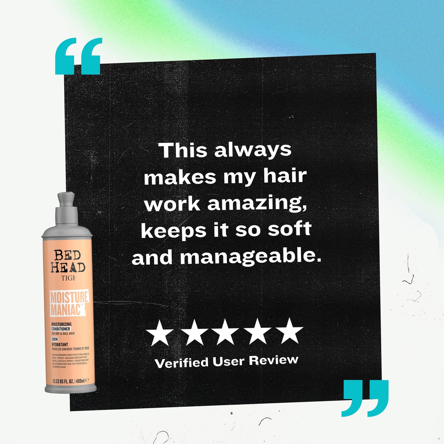 - Give dry hair a hit of moisture with the Bed Head Moisture Maniacᵀᴹ Conditioner! This rich conditioner deeply moisturises and conditions so hair is left hydrated, soft and shiny. The conditioner also helps detangle hair for a smooth end look.
